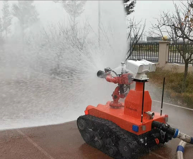 該機器人由本體、水炮、云臺、手持式遙控器組成。體積小巧,易于操作,消防水炮兼容消防車、市政消防水系統(tǒng)和手抬機動消防泵??商娲谰仍藛T進入易燃易爆、有毒、缺氧、濃煙等危險災害事故現(xiàn)場及樓宇、庫區(qū)等狹窄空間進行滅火、數據采集、處理、反饋等工作,有效解決消防人員面臨現(xiàn)場救援、數據信息采集不足等難題。