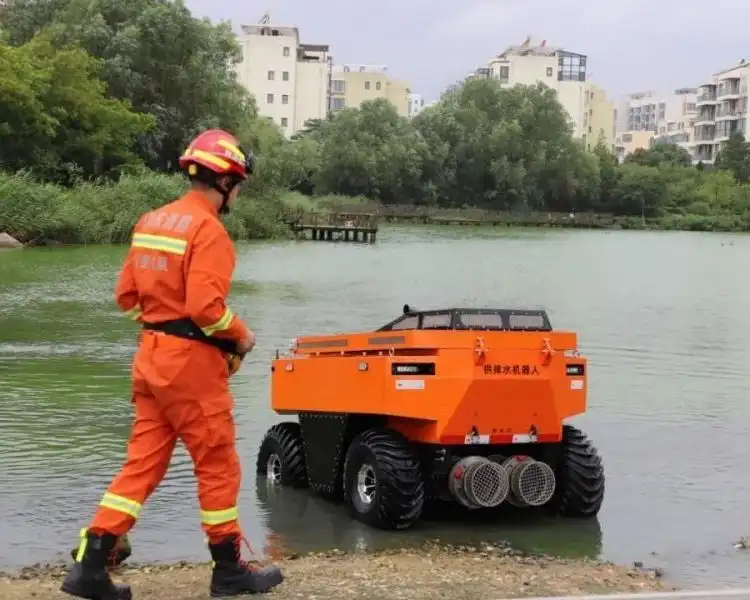 機(jī)器人由水陸兩棲底盤,集成大流量軸流泵、液壓動(dòng)力單元、液壓管路系統(tǒng)、遙控控制系統(tǒng),可直接拖拽水帶,進(jìn)入需要排澇的積水區(qū)域,把水排放到300米以外的區(qū)域??梢宰鳛檫h(yuǎn)程供水增壓模塊的前端取水模塊。應(yīng)用于內(nèi)澇排水和供水,實(shí)現(xiàn)小型化、輕量化,與現(xiàn)有供排水設(shè)備相輔相成,補(bǔ)充作業(yè)。